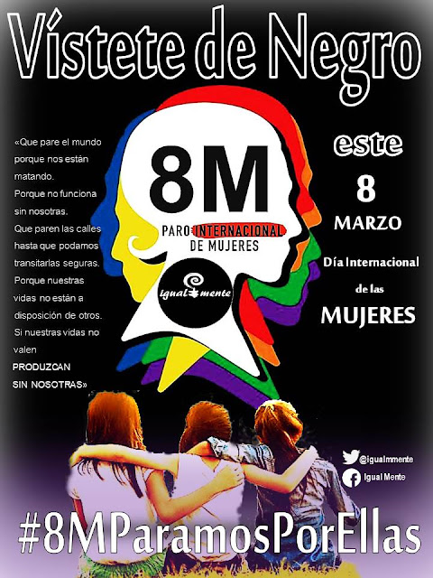 La propuesta está convocada por diferentes asambleas feministas del país, que recogen el testigo de las marchas mencionadas anteriormente. Según apuntan desde la asociación de mujeres Igualmente, «paramos y vestimos de negro para concienciar a la sociedad que la igualdad no es una realidad para las mujeres». El objetivo es llamar la atención sobre la lacra de la violencia doméstica y las desigualdades sociales de género en nuestro país: «Por las mujeres que se suman a la huelga este 8 de Marzo. Por las 20 mujeres y una bebé asesinadas por el machismo criminal en lo que va de año en España y por todas las que nos faltan. Por las 8 mujeres de Vela Luz que están en huelga de hambre en la puerta del Sol en Madrid, exigiendo al gobierno una acción inmediata para parar los asesinatos de mujeres», apuntan desde su cartel reivindicativo.