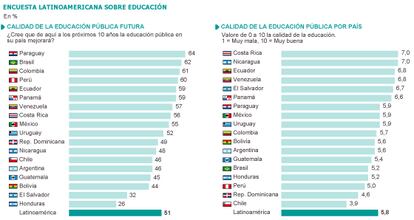 Y las exigencias van acompañadas de grandes expectativas. Uno de los principales resultados de la encuesta a 22.000 personas de 18 países de la región presentada ayer por la Organización de Estados Iberoamericanos (OEI) es que el 51,5% de los latinoamericanos considera que la educación pública de la región será mejor dentro de 10 años, otro 30,2% cree que será igual y otro 10,4%, peor (el resto no sabe o no contesta).