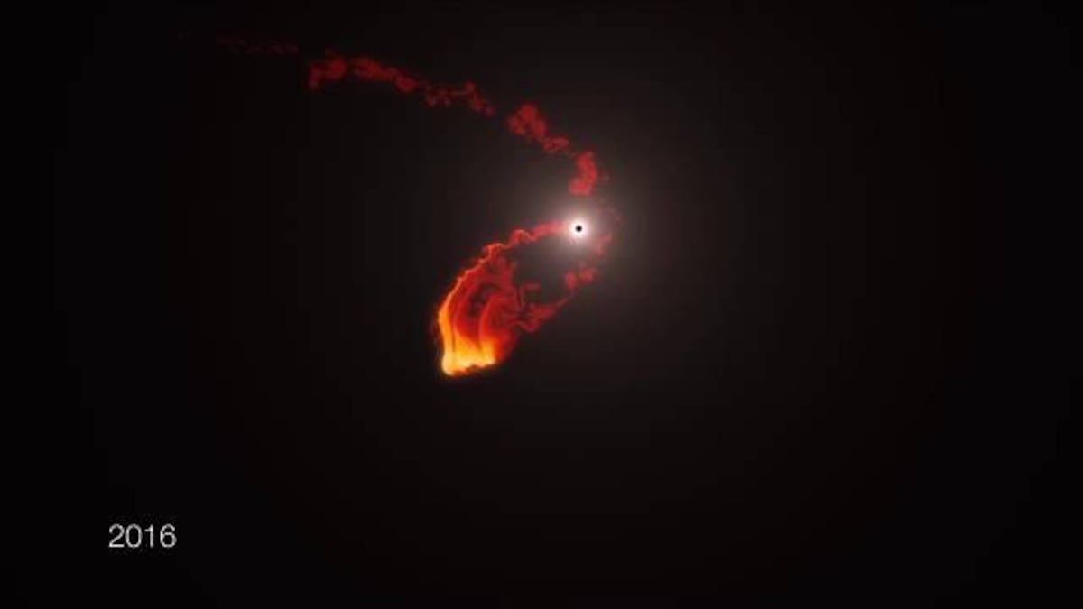 "El gas que se encuentra en la cabeza de la nube se estira a más de 160.000 millones de kilómetros alrededor del punto más cercano de la órbita del agujero negro. Y el máximo acercamiento es a tan solo unos 25.000 millones de kilómetros del propio agujero negro — apenas desaparezca caerá sumido en el olvido", explica en la web de ESO Stefan Gillessen (Instituto Max Planck de Física Extraterrestre, Garching, Alemania) quien lidera el equipo de observación. "La nube está tan estirada que el punto máximo de acercamiento no es un evento puntual, sino un proceso que se extiende a lo largo de un periodo de, al menos, un año".