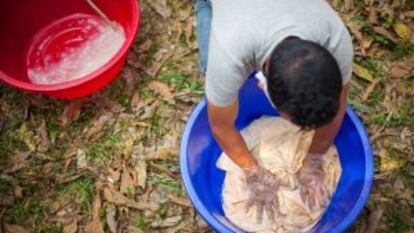 Pero esa elección es un privilegio de los visitantes. Quienes viven en la zona están continuamente expuestos a los mosquitos. La temporada seca es un buen momento para prepara las mosquiteras, redes de colores para hacerlas más atractivas. Todavía en Bangladesh se usan las que no están impregnadas de insecticida. En las afueras de Sapchhari, en pleno campo, un grupo de voluntarios se encarga de empaparlas en el insecticida. Más que atacar al plasmodio, la idea es evitar la picadura del mosquito.