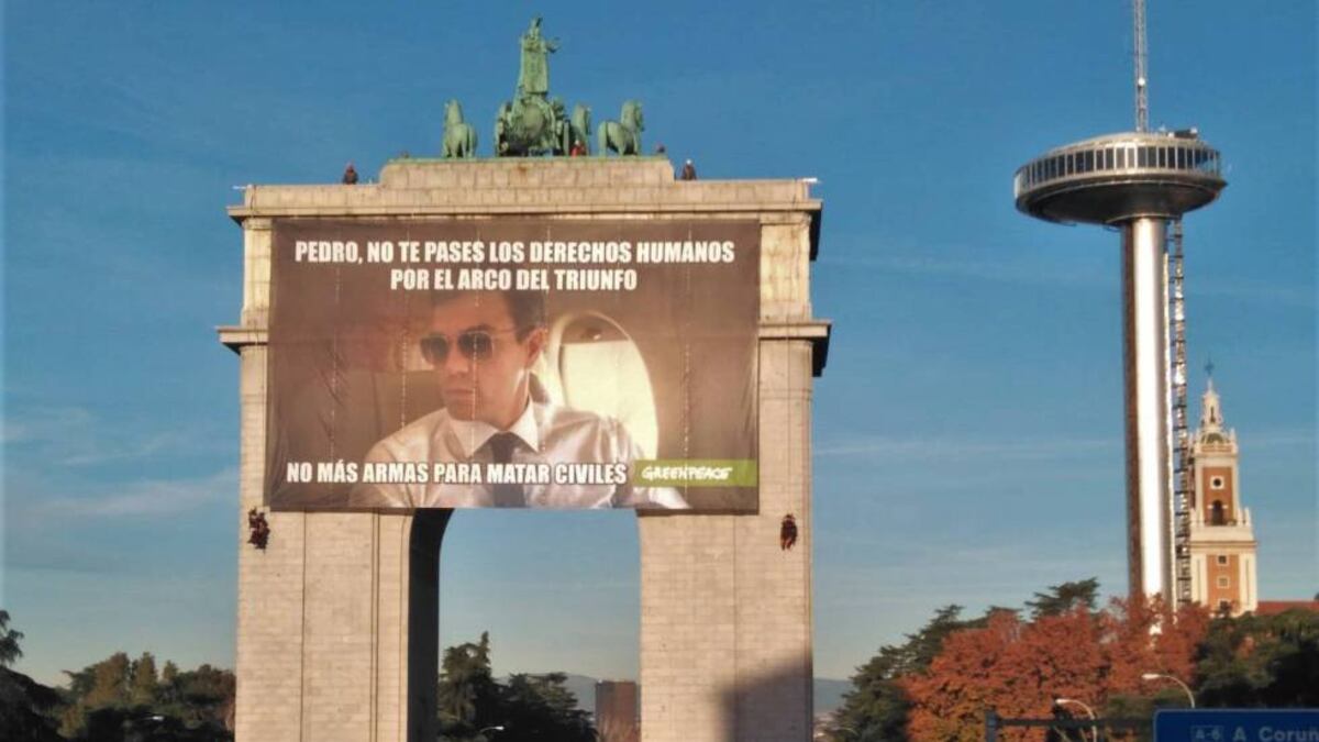 Un grupo de activistas de Greenpeace han colgado hoy un cartel gigante en el Arco de la Victoria de Moncloa, en Madrid, para exigir al presidente del Gobierno, Pedro Sánchez, ejemplaridad en el respeto a los derechos humanos y el fin de la venta de armas para matar civiles. "Pedro, no te pases los derechos humanos por el arco del triunfo. No más armas para matar civiles", reza el cartel gigante en el que aparece la conocida foto de Sánchez con gafas de sol en el avión oficial.
