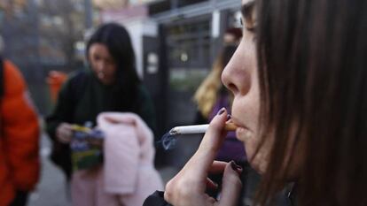 Apenas son las 11 de la mañana. Noa y Blu apuran el tentempié del recreo y se encienden sendos cigarrillos a las puertas del Colegio Lestonnac de Barcelona. Tienen 15 años y cursan 4º de ESO. Fuman desde los 13. “Se ha normalizado lo de fumar a nuestra edad. A los 13 o 14 empieza todo el mundo”, explica Noa sin reparos. La joven fuma “una cajetilla cada día y medio” y hasta hace un año también consumía cannabis y hachís. “Dejé los porros cuando me ingresaron en el hospital Clínic porque me ponía muy agresiva. Yo ya soy muy nerviosa y eso me afectó mucho”, relata. La última edición de la encuesta Edades, realizada por el Ministerio de Sanidad, constata un aumento del consumo de drogas entre los jóvenes, sobre todo de tabaco. El 25,4% de los menores encuestados refieren haberlo consumido en el último año. Hace dos años era el 20,6%.