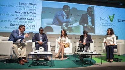 Desde la izquierda, el periodista de EL PAÍS Fernando Gualdoni, el vicepresidente de Alianzas Empresariales de Mastercard, Sapan Shah, la directora del Internet de las Cosas de Telefónica, Rosalía Simón, el director de Operaciones de Cintra, Nicolás Rubio y la jefa de Gestión de la Demanda y Red Inteligente de Red Eléctrica Española, Susana Bañares. En vídeo, así fue el foro.Vídeo: © CARLOS ROSILLO