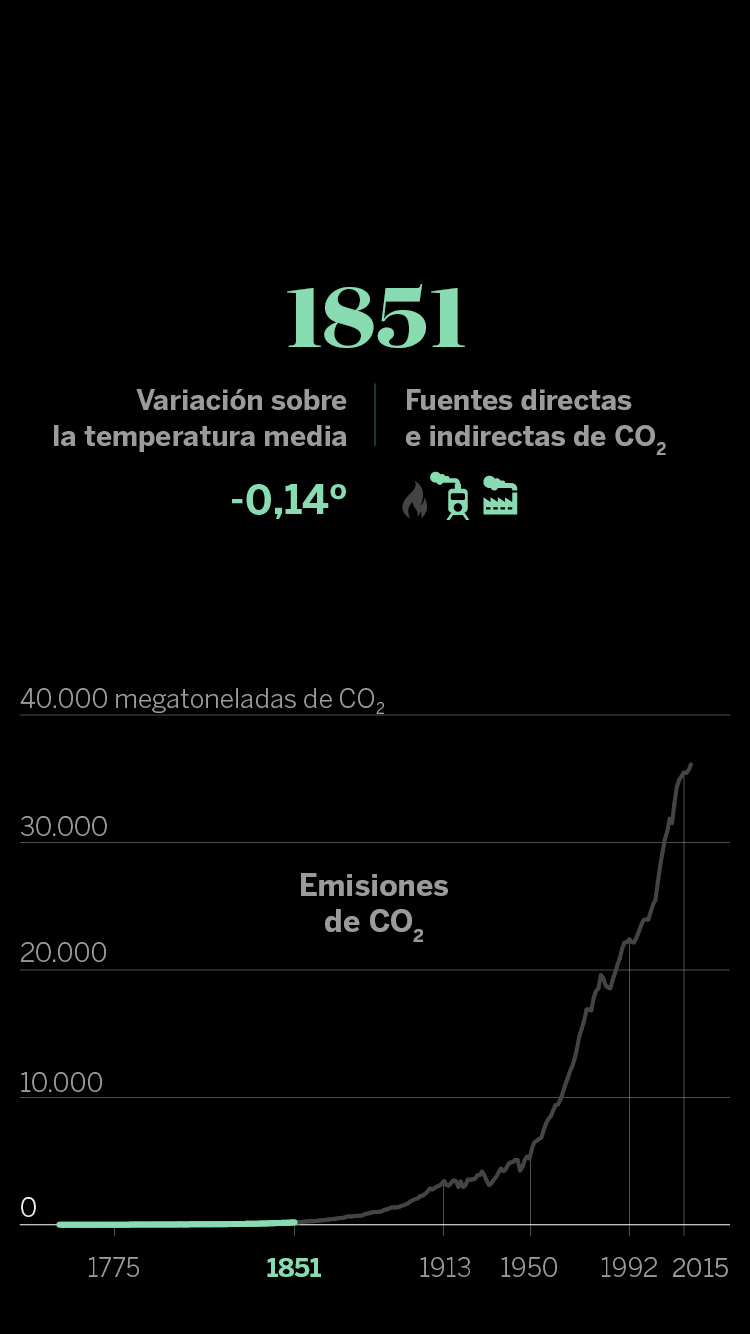 En cuanto a las infografías sobre la evolución del CO₂ vinculada a la acción humana, los datos de emisiones proceden del ‘Atlas del carbono’ del Global Carbon Project. En muchas ocasiones, esa relación se establece con las fuentes de energía (gas, petróleo y carbón, fundamentalmente) que, al quemarse, son las que emiten finalmente el dañino CO₂. Sin embargo, en este caso, para dejar más clara la relación entre causa (la acción del hombre en su vida cotidiana) y efecto (los gases), es preferible presentarlo con los principales adelantos tecnológicos y desarrollos sociales que, en cada periodo, han desencadenado aumentos exponenciales del consumo energético y, por lo tanto, de las emisiones.