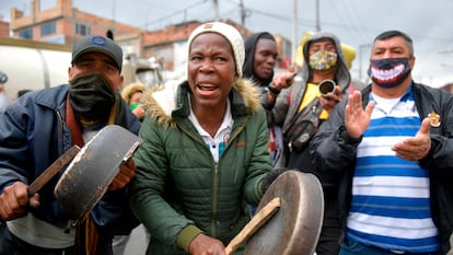 La postal se repite en los barrios altos de Medellín, donde suenan las cacerolas y la gente sale con banderas blancas pintadas de rojo; en la calurosa Ciénaga (Magdalena), ubicada en el norte del país; o en las laderas farragosas de Ciudad Bolívar, en la capital, donde se han presentado protestas y represión por parte de la policía antidisturbios. O en el barrio Bosa Porvenir, de Bogotá, donde decenas de personas bajaron los trapos rojos de las ventanas y salieron agitarlos y a cantar el himno de Colombia. “Somos una familia de nueve personas y no estamos en ningún listado del Gobierno, tengo una mujer embarazada y dos niños más en la casa y no tengo nada para darles de comer. Por eso estoy acá”, decía una mujer mientras sacudía una camisa roja de puntos blancos.