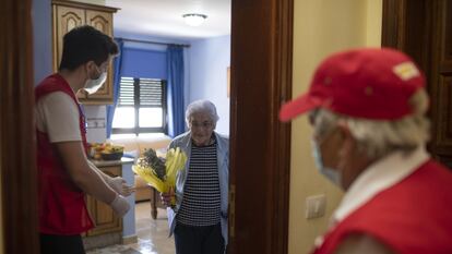 Un Seat León con el maletero lleno de ramos de flores y plátanos y bizcocho para la pausa. Este es el equipo de Carmen García, de 58 años, y Héctor Cabrera, de 24, para hacer del Día de la Madre una jornada especial, a pesar del confinamiento. Desde las 9.30 horas han repartido ramos a 25 madres en el programa de intervención social de la organización, como excusa para visitar –de lejos y ataviados de mascarillas y guantes– a los mayores del municipio gomero de Alajeró, un proyecto en colaboración con el Ayuntamiento. Si bien el lunes La Gomera, El Hierro, La Graciosa y Formentera inician la primera fase de la desescalada, el 3 de mayo se celebró en los jardines y en compañía de los convivientes. Pero con flores, besos volados y saludos de codo a codo.