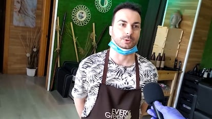 Jonathan Romero y Paqui Palma, propietarios de la peluquería Kolosseum de Granada, preparan pasadas las 9.00 todo para empezar a atender clientas una hora después. Se han acogido a las ayudas para autónomos, y han aplicado un ERTE a sus cuatro empleados. Jonathan conoce las medidas de precaución sanitaria, pero se queja de no haber recibido "ninguna indicación laboral. No sé si mis empleados pueden volver a trabajar hoy o no. Estoy esperando a que abra mi gestoría para que me diga qué tengo que hacer. De hecho, ni siquiera sé si es legal que yo abra la peluquería”, comenta.