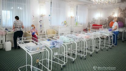 Las imágenes parecen sacadas de una película distópica. En una se ven largas hileras de recién nacidos en sus cunitas atendidos por varias mujeres. En otra, estas tienen en brazos a los bebés y sonríen a cámara, o eso se intuye bajo las mascarillas que les cubren nariz y boca. También les cambian el pañal o les dan un biberón, con las manos enguantadas. Son trabajadoras de una empresa de gestación subrogada de Ucrania y están al cargo de los bebés, nacidos durante el confinamiento por la pandemia, hasta que las familias extranjeras puedan ir a recogerles. “El coste de mantener a un niño ha bajado de 50 euros a 25”, reza el anuncio de BioTexCom, la mayor compañía en este sector del país.