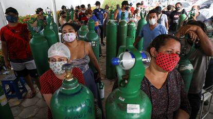 El guarda de seguridad con chaleco antibalas que corre seguido por una mujer sujeta con extrema delicadeza el cilindro azul, como si fuera un bebé. Es oxígeno. Ambos avanzan bajo un sol abrasador hacia un coche. “Es para mi madre”, responde Afra Benedito, de 46 años. Cuenta angustiada que la bombona ayudará a la señora Fátima a respirar durante cuatro horas más. Con 71 años, el coronavirus la dejó viuda hace unos días y ahora extingue su vida en Manaos, la capital de la Amazonia brasileña, donde la pesadilla de morir asfixiado se ha convertido en cruda realidad en hospitales y hogares.