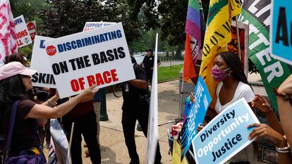 La policía desalojó este jueves los aledaños del Tribunal Supremo poco después de publicar dos sentencias históricas que daban un golpe mortal a la discriminación positiva por raza en el acceso a las universidades. Un agente de policía explicaba que se debía a un paquete sin identificar, potencialmente explosivo. Falsa alarma. La que sí era explosiva era la decisión del tribunal, otra vuelta de tuerca en su giro conservador. Grupos de manifestantes a favor y en contra de la sentencia se retaban este jueves dialécticamente, y a veces algo más, en las cercanías del tribunal.