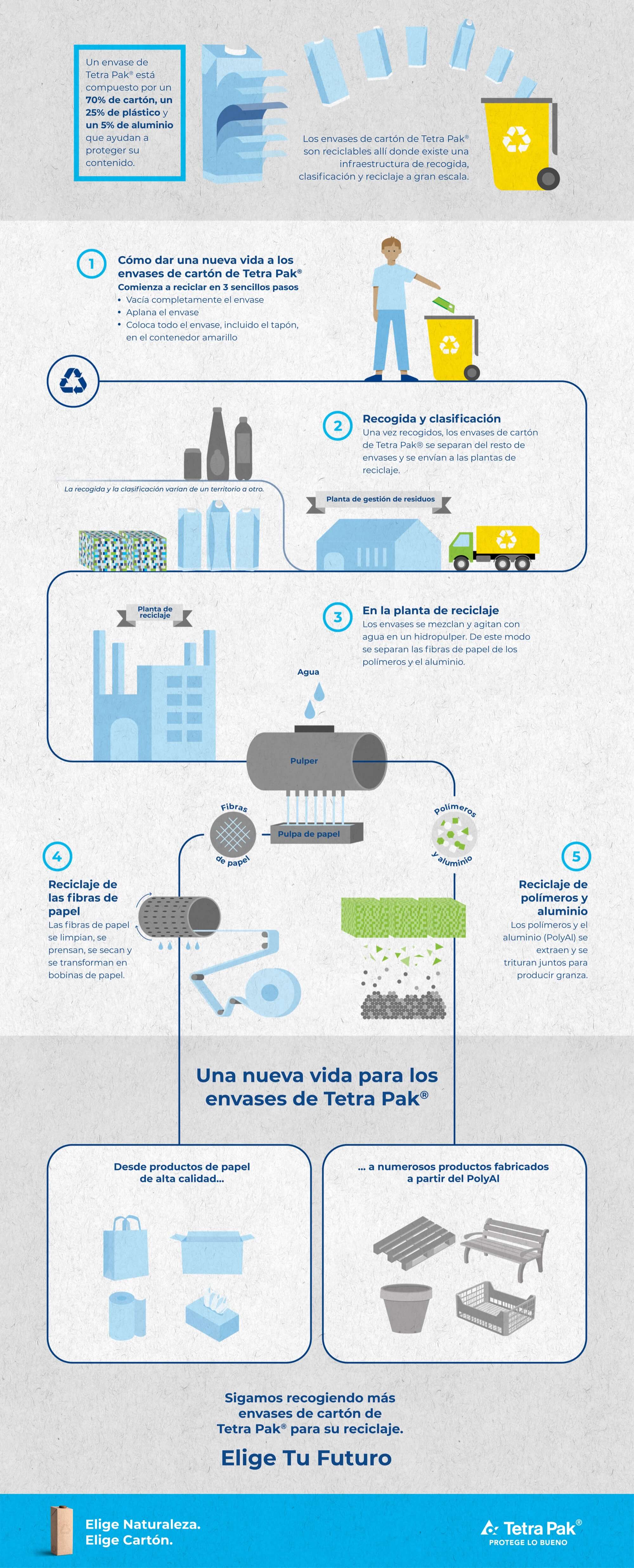 El proceso de reciclaje de estos envases comienza en los contenedores de color amarillo, donde el consumidor debe depositarlos una vez usados. A continuación, los camiones los recogen y los trasladan a una planta de clasificación de residuos. Allí se dividen por tipos de materiales, formando balas, que se envían a la planta recicladora. Es aquí donde los envases de cartón se mezclan y agitan con agua en una máquina hidropulper, que separa los distintos componentes. En este proceso mecánico, las fibras de papel se prensan, se secan y se transforman en bobinas de papel de alta resistencia, con el que se fabricarán numerosos productos: bolsas, cartón ondulado, cajas y estuches de cartón, materiales para la construcción… Además, como las fibras pueden reutilizarse varias veces gracias a su larga longitud y resistencia, es posible reutilizarlas en varios ciclos.