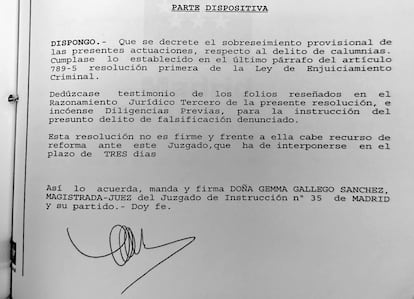 Así, el juez falló que la “prueba de la excepto veritatis se considera suficiente para sobreseer la causa respecto del delito de calumnias”; que Dell’Atte no mentía al llamar a Lecquio maltratador. Y ordenó a la vez abrir “diligencias previas, para la instrucción del presunto delito de falsificación denunciado”, por la alusión de Lecquio a que Dell’Atte había falsificado el justificante de la denuncia contra él de 1991.