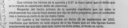 La querella incluye que la exmodelo “jamás interpuso una denuncia por malos tratos ya sean físicos y psíquicos” aunque sí por “amenazas, injurias y delito de impago de pensiones y abandono de hogar”; que se “dictó Auto de Sobreseimiento Provisional con fecha 23 de abril de 1991″; y que hubo “diversas circunstancias” que hacían que esas declaraciones fueran “de una severa y alarmante gravedad”. Entre ellas, que fueron “repetidas hasta lograr que las mismas hayan calado en el conocimiento y la conciencia del público en general”.