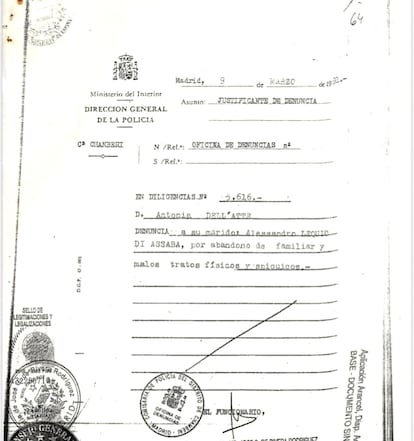 El 9 de marzo de 1991 a las 16.45 horas de la tarde Antonia Dell’Atte acudió a la comisaría de Chamberí, en Madrid, para denunciar a Alessandro Lecquio di Assaba “por abandono de familia y malos tratos físicos y psíquicos”. El atestado recoge que esa mañana, a las 8.30, Dell’Atte encontró a Lecquio, que según explicaba en el atestados apenas pasaba ya por casa, embalando muebles y con un camión de mudanzas en la puerta.