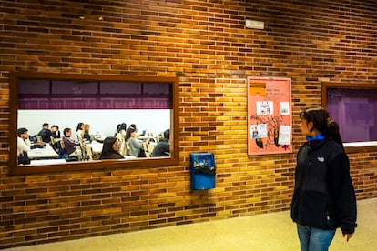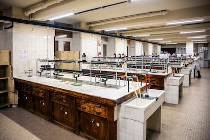 Eso se traduce en que cualquier facultad, cualquier departamento y cualquier actividad cuenta con el 35% menos de un presupuesto ya de por sí adelgazado. En la facultad de Matemáticas, por ejemplo, los 410.000 euros anuales que recibía desde 2008 se han convertido, de pronto, en 270.000. En la facultad de Veterinaria, los 800.000 en 520.000. En el departamento de María José Díaz, profesora de Sociología de la facultad de Económicas, cuentan con un presupuesto anual de 2.300 euros para siete personas del que tendrán que extraer los fondos para pagar el material, el teléfono, los viajes a congresos, las fotocopias o cualquier otro gasto imprevisto. En la facultad de Políticas y Sociología solo se pudieron comprar este año diez sillas nuevas para profesores a pesar de que la comisión de riesgos laborales aconsejaba que se adquirieran muchas más dadas las particularidades ergonómicas de las sillas viejas. Esta misma facultad cuenta con un laboratorio de imagen construido en los años ochenta que bien podría servir para rodar un capítulo de Stranger Things. “Es un poco vintage, sí”, reconoce la voluntariosa decana de esta facultad, Esther del Campo. La facultad disfruta, eso sí, de una biblioteca moderna que dispone de unos ventanales amplísimos por los que entra una luz natural preciosa. Almacena además colecciones bibliográficas inusuales, como los 20.000 ejemplares de libros sobre África donados de un centro misionero. Pero el miércoles pasado, la misma lluvia que empapaba al frustrado bibliotecario José Antonio Magán se filtraba por el tejado mal cerrado de la biblioteca de Políticas. Como otras veces, colocaron unas papeleras recubiertas de plástico en lo alto de las estanterías para que las goteras no estropearan los libros. Ese mismo día hubo goteras en los pasillos de Periodismo y en varios despachos de la facultad de Medicina.