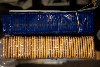 A primera vista, envueltas en una película de polipropileno (resistente a la luz ultravioleta) azul, las galletas parecen recién fabricadas a finales de 2025. “Protein reinforced equilibrated biscuit made in Spain” (Galleta equilibrada reforzada con proteínas, fabricada en España), se lee. García Ramos las sostiene como si fueran un tesoro. “No las vamos a abrir, pero hace cinco años el último paquete apenas tenía un pequeño toque rancio. Por lo demás, estaban igual que hace 40 años”.
