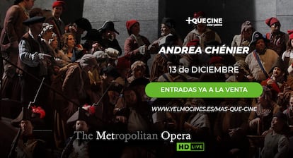 Andrea Chénier será la última proyección del año de la temporada MET en Cine Yelmo, en directo desde Nueva York. Desde la comodidad de la butaca podrás disfrutar de una ópera tan apasionante como trágica protagonizada por el aclamado tenor Piotr Beczala. La inmensa tragedia del mítico compositor Giordano se podrá ver el sábado 13 de diciembre a las 19:00 (18:00 en Canarias). Por ser lector de EL PAÍS, consigue una entrada doble y no te pierdas la última proyección del año en el Yelmo Cine de tu ciudad.