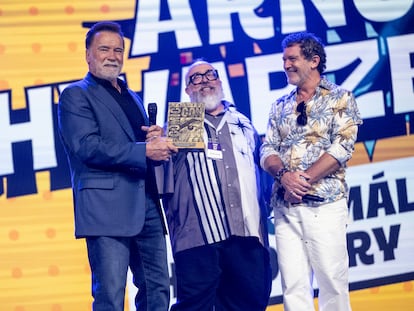 Antonio Banderas entrega el premio de artista homenajeado a Arnold Schwarzenegger en la Comic Con Málaga