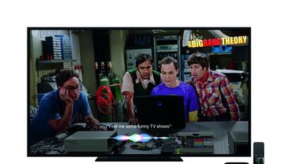 También integra dos micrófonos que, combinados con Siri, posibilitan las búsquedas por voz: basta con pulsar sobre el botón de esta función situado en el mando a distancia para que el asistente de Apple localice programas de televisión o películas en iTunes y algunas apps habilitadas. El entendimiento es muy bueno sin necesidad de acercarse el mando a la boca (un micrófono capta la voz y el otro el ruido exterior para neutralizarlo), y permite no solo buscar el título concreto, sino pedir ayuda para encontrar otras en función del género cinematográfico o a sus protagonistas. Por ejemplo, a la petición "Películas de risa de los 90", Siri responde mostrando Algo pasa con Mary, Dos tontos muy tontos o Solo en casa. Luego, la búsqueda se acota especificando los actores protagonistas, el director o la valoración de la crítica. Siri también puede utilizarse para controlar la reproducción: reanudarla, pausarla y trasladarse a un minuto concreto de la cinta, o para acceder a otro tipo de información relacionada con los deportes o el tiempo.