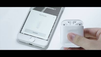 En lo sucesivo serán con cable a través del conector de carga, con un adaptador que vendrá de serie al comprar el teléfono, o inalámbricos, si se compran aparte. Los AirPods son sus auriculares sin cable. Detectarán cuándo están en la oreja del consumidor, su voz, si se mueve. Tienen una autonomía de cinco horas. La caja para guardarlos sirve también de batería.