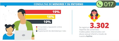 La madre de un menor llamó al 017 porque un desconocido le exigía dinero por Bizum, amenazando con difundir un montaje fotográfico falso que simulaba que su hijo era pedófilo. Un 18% de las consultas de 2025 estaban relacionadas con la sextorsión. “El año pasado notamos un aumento de estos casos”, señala Valdés. Al teléfono llaman tanto los menores como los padres, e incluso ambos de forma conjunta, para pedir orientación y ayuda.