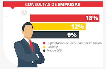 El fraude del CEO representa alrededor del 9% de las consultas. Consiste en la suplantación del director de una empresa para ordenar movimientos de dinero mediante correos fraudulentos o incluso voz generada con IA. Los mensajes indican transferencias a cuentas controladas por ciberdelincuentes, aunque la comunicación sea falsa. Para prevenirlo, Valdés recomienda un doble nivel de verificación en las operaciones económicas, de modo que no dependa de una sola persona. También aconseja utilizar una palabra clave o contraseña compartida entre quien da la orden y quien la ejecuta, con el fin de confirmar la legitimidad de la solicitud.