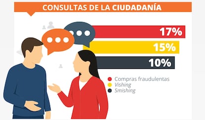 Tras las compras fraudulentas, las consultas más frecuentes de la ciudadanía están relacionadas con ataques de ingeniería social, especialmente llamadas (15%) y SMS fraudulentos (10%). “Hace unos años, el phishing [robo de información sensible a través de enlaces fraudulentos] estaba entre los métodos más comunes, pero ahora ha descendido un poco, ya que se usan cada vez más mensajes y llamadas fraudulentas”, explica Valdés. Es lo que se conoce como smishing (SMS fraudulentos) y vishing (llamadas). Un ejemplo sería el de un usuario que recibió una llamada de un supuesto agente de la Guardia Civil sobre una falsa multa de tráfico.