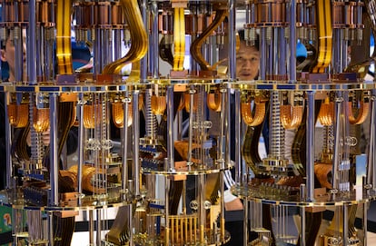A la feria IBM ha traído su Quatum System Two, una plataforma modular de computación cuántica. Era la oportunidad de admirar un esbozo de cómo sería realmente un ordenador cuántico. El sistema que exponía IBM está pensado para operar con temperaturas cercanas al cero absoluto (-270 grados) y diseñado para reducir la tasa de error, uno de los principales escollos para lograr la computación cuántica. Durante el Mobile se ha hablado mucho de esta tecnología y el Quatum System Two le ha puesto cara.