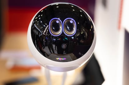 Entre las excentricidades tecnológicas que siempre adornan el stand de Lenovo había un portátil que proyectaba imagen en 3D o un prototipo de portátil modular. Pero lo más llamativo era otro dispositivo conceptual: el compañero IA de trabajo. Consiste en un brazo robótico de sobremesa coronado por una esfera que hace las veces de cabeza y cara.