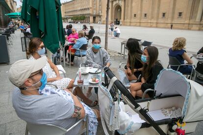 Un grupo de personas en la terraza de un bar en Zaragoza.Javier Cebollada (EFE)