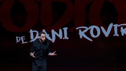 Odio es un monólogo que tiene ya dos años de antigüedad y que Rovira dejó de representar en directo por causas ajenas a él. Primero la pandemia y luego un linfoma de Hodgkin, con sus consiguientes sesiones de quimioterapia y radioterapia, pausaron su vida. Ahora lo ha recuperado con algún retoque. “El texto es el mismo de hace dos años, desde antes de la III Guerra Mundial”, bromea, “lo que pasa es que como ha pasado todo lo que ha pasado, había factores que yo tenía que mencionar en algún momento, no iba a hacer un espectáculo como si nada hubiera ocurrido. En el primer bloque hay un elefante en la habitación, que tenía que mencionar. En cinco minutitos me pude quitar el hecho de que ha pasado una pandemia, de que he pasado lo que he pasado y a partir de ahí el texto es prácticamente el mismo. Es verdad que ahora, de manera casi mágica o de serendipia, tiene mucho más sentido que hace dos años, yo mismo hasta me asusté cuando empecé a tirarlo”.