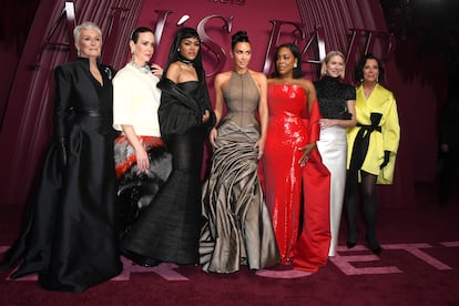 Colocar a Kim Kardashian (Los Ángeles, 45 años) en cualquier situación, ya sea una serie, una sala de cine o una rueda de prensa, puede tener un problema: que sea el centro de atención. Pero claro, eso también puede ser una ventaja, si lo que se quiere es que Kim Kardashian sea, precisamente, el centro de atención. Y eso es lo que busca, pretende y logra el creador Ryan Murphy en su nueva serie, Todas las de la ley (All’s Fair, en el original en inglés, por el dicho “Todo es justo en el amor y en la guerra”; Todo vale, en América Latina), que llega el martes 4 de noviembre a Disney+. Porque aunque rodee a Kardashian de joyas de impresión, casas de infarto, looks de alta costura, sensuales tramas y, sobre todo, de actrices como Naomi Watts, Glenn Close, Sarah Paulson, Teyana Taylor y Niecy Nash, la Kardashian es demasiado Kardashian como para perder un ápice de protagonismo.
