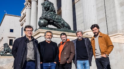 También algún día de rodaje intenso en el Congreso de los Diputados, ese lugar frente al que posan en una mañana de noviembre, ya devueltos a su propio ser. Lo lograron bajo la condición de que si se convocaba un pleno extraordinario —y con la situación política actual, podría ocurrir en cualquier momento— debían desmontar todo en tres horas.
