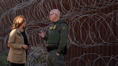 Kamala Harris ha hecho su primer viaje a la frontera con México como candidata a la presidencia de Estados Unidos. La aspirante demócrata ha elegido para ello el Estado de Arizona, uno de los siete territorios en disputa rumbo a los comicios del 5 de noviembre. La demócrata ha querido mostrarse en su gira como una figura capaz de aportar soluciones a la compleja dinámica fronteriza. Y justo en un momento donde su rival, Donald Trump, carga contra la política migratoria de la Administración de Joe Biden. “Buscaremos que se castigue más severamente a los reincidentes [que cruzan la frontera ilegalmente] y si alguien no pide asilo y cruza ilegalmente el asilo le será negado”, aseguró Harris en un evento en el condado de Cochise, una zona que Trump visitó el mes pasado. Harris recorrió antes un pedazo del muro fronterizo reforzado con concertina y se entrevistó con agentes de la Patrulla Fronteriza.