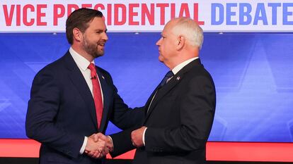 El debate vicepresidencial de este martes en las elecciones de Estados Unidos ha sido el primer y último cara a cara entre los candidatos Tim Walz y J. D. Vance, los compañeros de Kamala Harris y Donald Trump en sus respectivas papeletas. Producido por la cadena CBS en un plató de Nueva York, el enfrentamiento tuvo un tono mucho menos elevado que aquellos en los que el protagonista ha sido el expresidente Trump. Tanto Walz como Vance respetaron los turnos de intervenciones, excepto un momento en el que el republicano se alargó en una respuesta y le apagaron el micrófono. Hubo momentos de solidaridad, como cuando Vance lamentó que el hijo del Gobernador de Minnesota haya presenciado un tiroteo. Y las moderadoras pusieron a Walz contra las cuerdas con una pregunta sobre sus menciones a viajes pasados a China. Aquí algunos de los momentos clave del último debate de la campaña, a 35 días de la cita en las urnas.