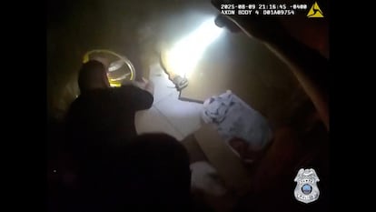 Los familiares alertaron a la policía sobre un hombre que había quedado atrapado al interior. En el video se ve a los policías realizar varios intentos por entrar, sin lograr alcanzar a la persona. Finalmente consiguen sujetarlo de un tobillo y estraerlo.