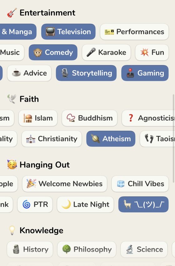 Después de entrar a Clubhouse y seleccionar los contactos a los que seguir, la aplicación muestra un listado de intereses para seleccionar cuáles son tus aficiones (música, televisión, cómic, videojuegos…), tu religión (cristiano, budista, taoista, ateo…), qué lenguas hablas, con qué te identificas (negro, latino, genZ, babyboomer…), etc. Sin embargo, no sirve de mucho: por la mañana, al no haber un volumen demasiado grande de usuarios, tanto el menú de “explorar” como el de salas que tendrán lugar próximamente no muestran solo charlas relacionadas con tus intereses, sino lo que hay en ese momento. Después de marcar que hablaba español y que me interesaban la televisión, los videojuegos, la comedia y el manga, las primeras salas que me aparecían en el listado –y las primeros a las que entré, aunque solo para escuchar– eran Chat empresarial - gurús no, gracias (sobre marketing y empresas) y Welcome to clubhouse Malasya (sobre… no lo sé, estaban hablando en malayo). Bien entrada la tarde y por la noche, aunque las salas seguían sin coincidir 100% con mis prefererencias, había mucha más variedad.