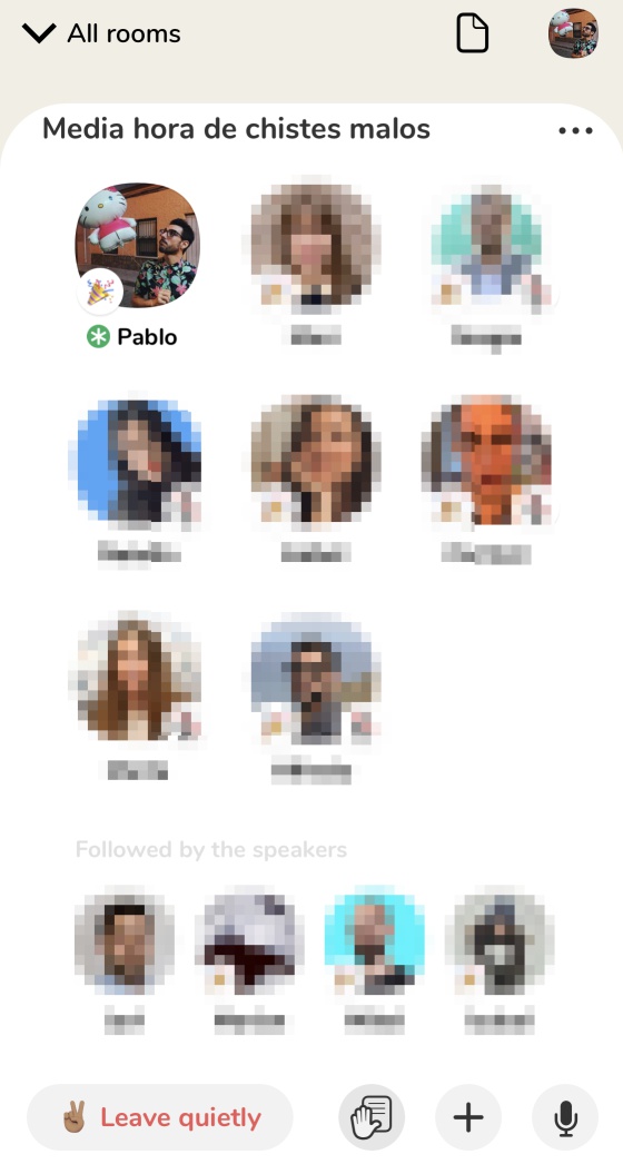 Fernando de Córdoba y David Belzunce, expertos en marketing y redes sociales que llevan varias semanas probando formatos en la aplicación, me explicaron (a través de una sala privada de Clubhouse) que ellos suelen prepararse los diez primeros minutos de charla de sus salas para no generar silencios incómodos y allanar el terreno hasta que el resto de usuarios se animen a hablar. La segunda cosa que aprendí es que, para evitar esos silencios, también es recomendable que el peso de la sala se lleve entre dos personas. La sala de chistes malos acabó siendo muy divertida, pero los primeros minutos fueron muy extraños: es realmente incómodo contar un chiste y que la única respuesta sea un silencio total.