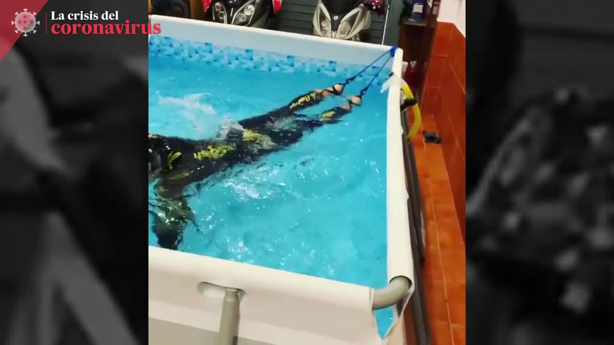 La triatleta Judith Corachán, que quedó tercera hace solo unos pocos días en la prueba Ironman celebrada en Nueva Zelanda, se las ha ingeniado para continuar con su preparación al instalar una piscina inflable en el garaje de su casa, donde al menos puede dar unas brazadas y estar en contacto con el agua. La deportista catalana ha subido a sus redes sociales el vídeo en el que muestra cómo entrena con los escasos medios que tiene a su disposición. El podio que obtuvo en Nueva Zelanda el pasado 6 de marzo la clasificó directamente para el Campeonato del Mundo de la especialidad en Kona (Hawai), una prueba que se disputará el 10 de octubre, pero que está en el aire a causa de la pandemia mundial.