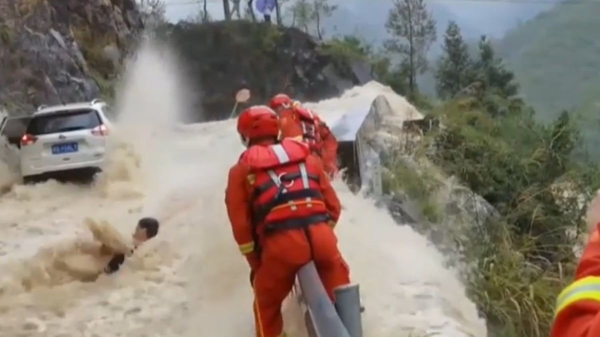 Un tifón que ha dejado a su paso intensas lluvias, vientos e inundaciones en China, ha mostrado una escalofriante imagen de las consecuencias de estos fenómenos climatológicos. En el vídeo que acompaña a esta noticia, se puede ver a un vehículo, con el conductor en su interior, incapaz de avanzar ante la riada que lo rodea, en la carretera de un barranco. Un equipo de bomberos procede a su rescate, y una vez lo tienen asegurado, arrastran a la persona hacia el arcén.