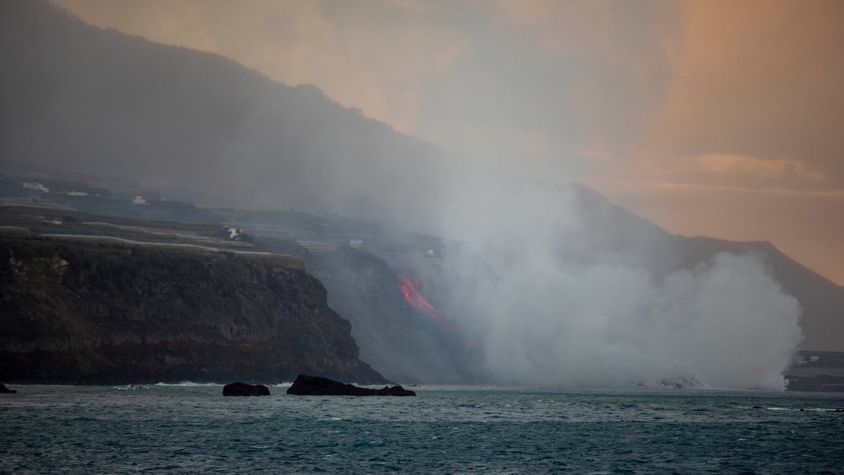Tras tocar el mar por primera vez alrededor de las 11 de la noche de este martes, la colada de lava proveniente del volcán de La Palma se precipitó por un acantilado de 100 metros y el contacto creó una nube tóxica que el viento ha proyectado al interior de la isla. En las últimas horas el avance de la lava ha sido constante y sus efectos ya se podían observar en el amanecer de la isla.