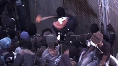 La selección muestra momentos muy concretos, como cuando el grupo de migrantes golpea intensamente —con un mazo— la puerta que da acceso al lado español. Esa secuencia frente a la puerta, algo más corta, ya había sido publicada por La Sexta en junio. También puede verse el instante en el que se produce la avalancha, aunque no la agonía posterior de las víctimas. Otra de las secuencias muestra a cientos de personas una vez que consiguen entrar en Melilla. Es uno de los momentos en los que se les ve más exaltados, golpeando con palos el guardarraíl que sirve de barrera de contención. Esa secuencia, que es mucho más larga, acaba con varios migrantes tirados en el suelo.