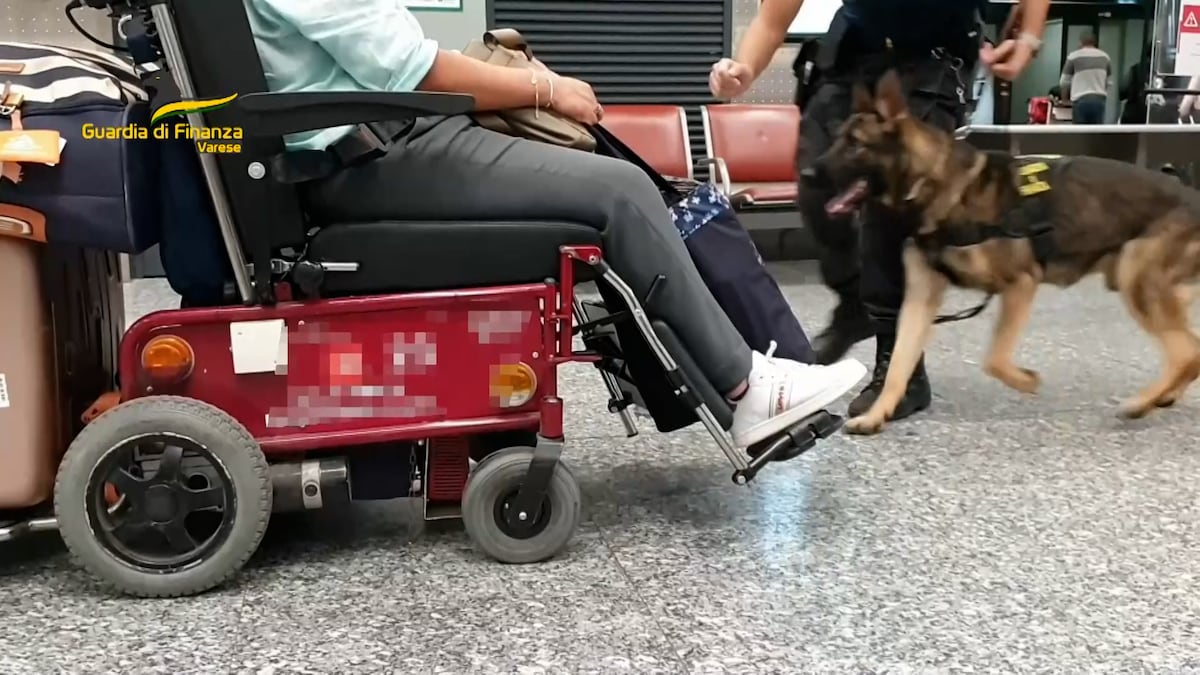 Como puede verse en el vídeo que acompaña esta noticia, la Guardia de Finanza italiana ha incautado ocho kilos de droga que estaban ocultos en la silla de ruedas de un pasajero estadounidense que llegó al aeropuerto de Malpensa, en Milán, en un vuelo procedente de La Romana, en Santo Domingo. El pasajero se presentó en la puerta de llegadas del aeropuerto en una silla de ruedas y con un aparato ortopédico en la pierna derecha, pero inmediatamente un perro antidroga señaló la presencia de estupefacientes.