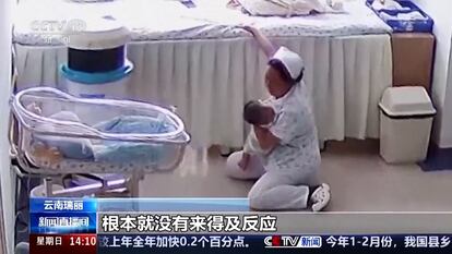 Dos enfermeras protegen a los recién nacidos en una maternidad china durante el terremoto de Myanmar