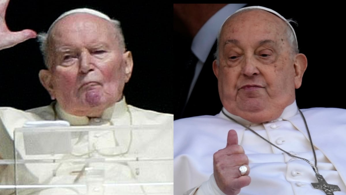El Papa Juan Pablo II en el Vaticano, en 2005, y el Papa Francisco al salir del hospital en Roma, en marzo de 2025. Foto: REUTERS | Vídeo: EPV