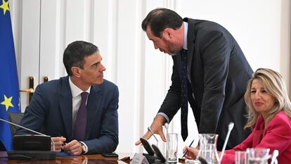 Pedro Sánchez junto a Óscar Puente y Yolanda Díaz, durante la reunión.