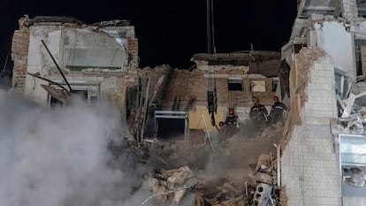 Las tareas de rescate del edificio de viviendas bombardeado por Rusia en Ternópil, a vista de dron