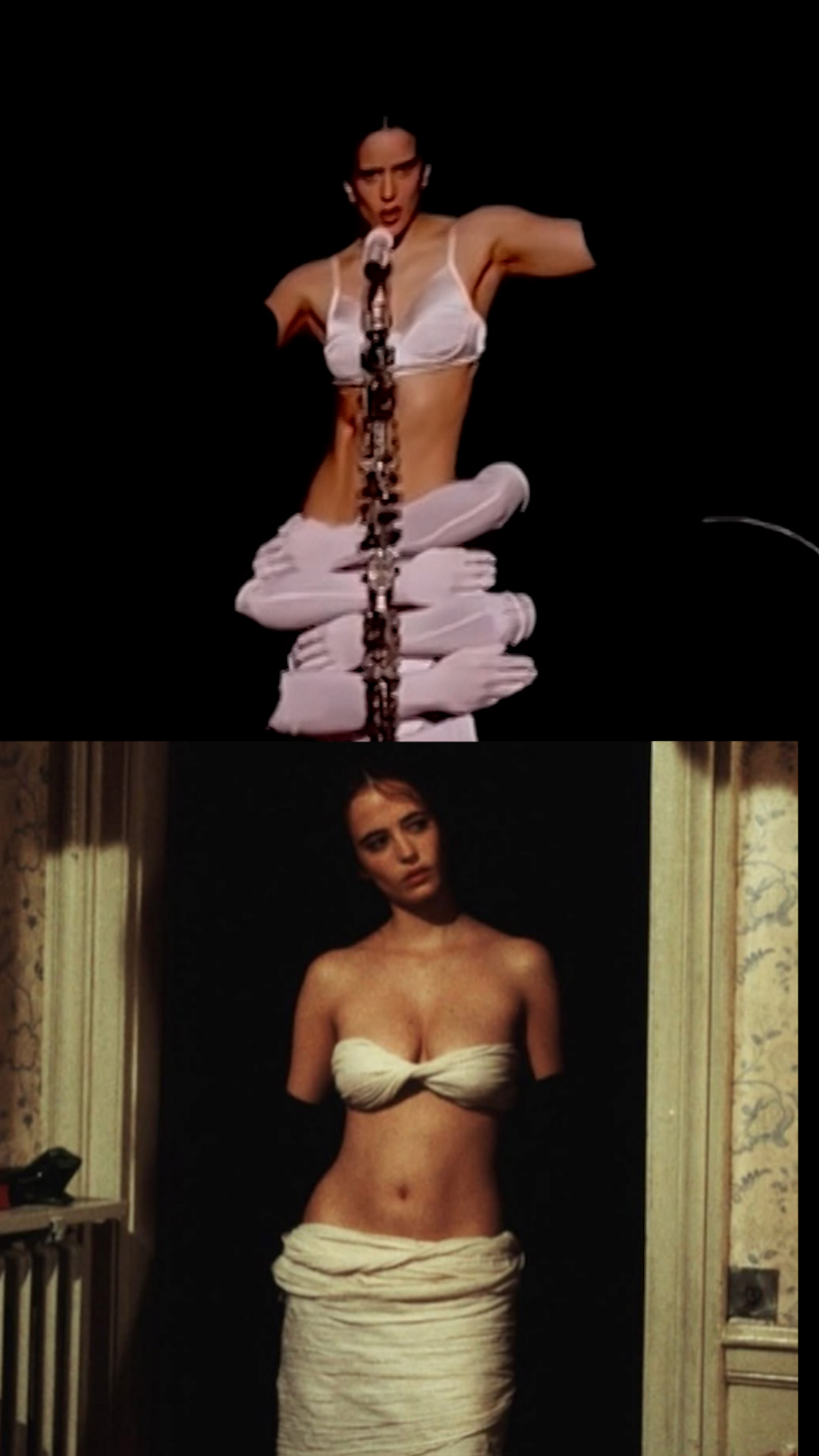 Fotomontaje de un momento del concierto de Rosalía en el 'Movistar Arena' de Madrid el pasado 30 de marzo, junto a la actriz Eva Green en una escena de 'The Dreamers'.Foto: Sharon López | Vídeo: ÁLVARO GONZÁLEZ ROLDÁN